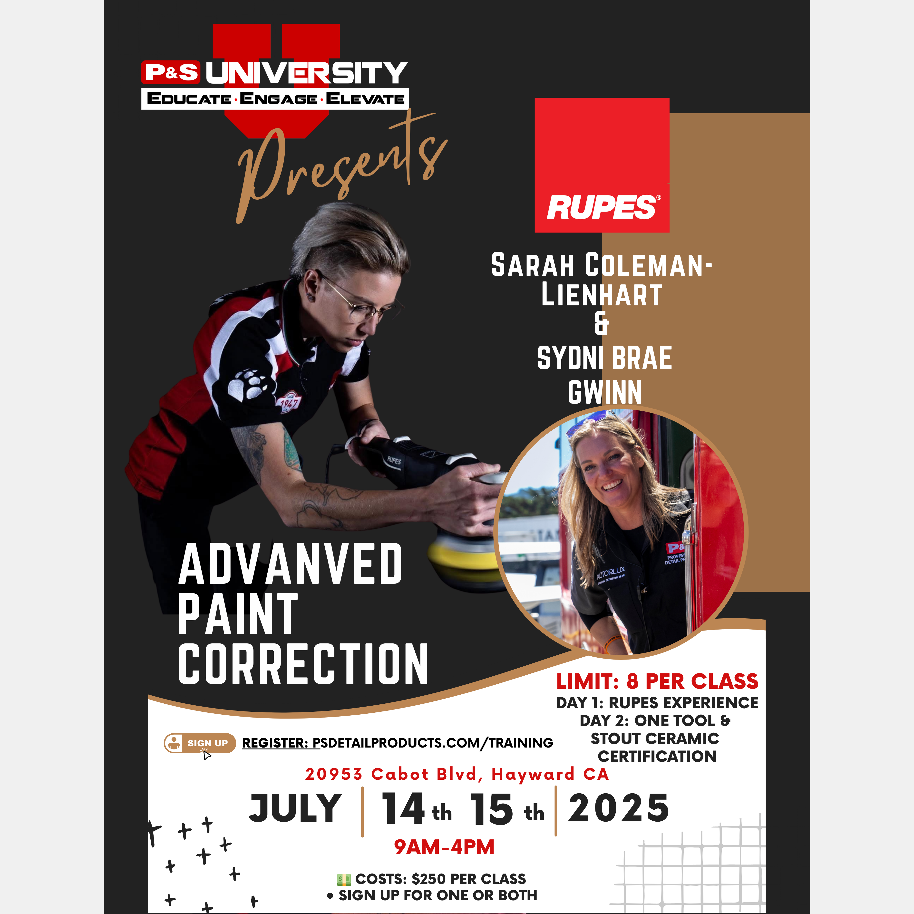 Join expert instructors Sarah Coleman and Sydni Brae Gwinn for an immersive, hands-on training event focused on Advanced Paint Correction techniques. Hosted by P&S University in partnership with RUPES, this exclusive two-day training will take place at 20953 Cabot Blvd, Hayward, CA on July 14th & 15th, 2025, from 9 AM to 4 PM each day.