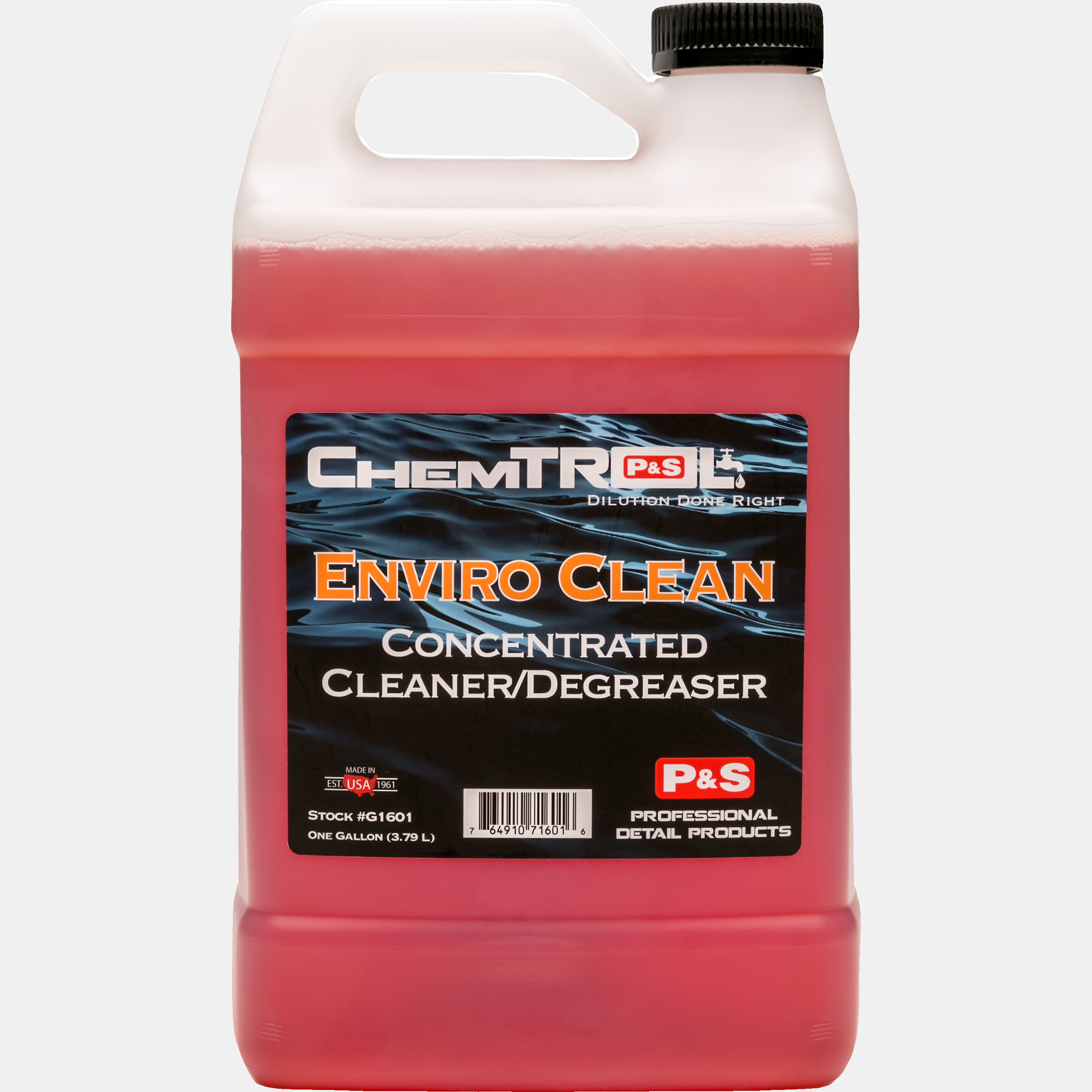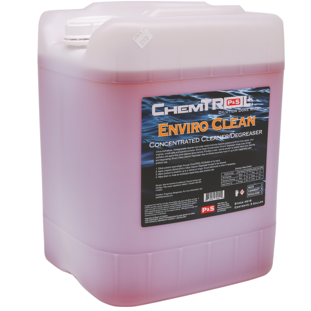Citrus derivatives, biodegradable cleaners and water based solvents dissolve grease and lift dirt from carpet, vinyl, engines, wheel wells and painted surfaces. Enviro Clean Concentrated Cleaner Degreaser rinses away foreign particles and stains that most cleaners leave behind. Provides a safe, natural solution to vehicle heavy duty cleaning and degreasing. Enviro Clean Cleaner Degreaser may be diluted anywhere from 4:1 up to 20:1 depending upon product use.